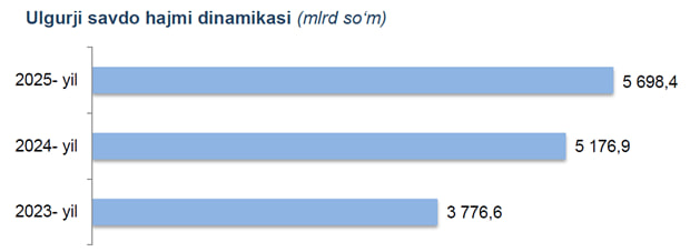Farg‘ona viloyati statistika boshqarmasi bergan ma'lumotiga ko‘ra, 2025- yil 1- noyabr holatiga ulgurji savdo sohasida faoliyat ko‘rsatayotgan tijorat korxonalari soni 4 282 tani tashkil etgan.