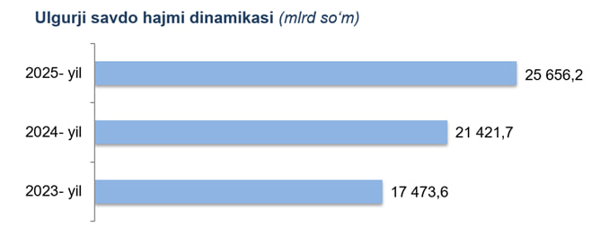 Farg‘ona viloyati statistika boshqarmasining bergan ma'lumotiga ko‘ra, viloyat bo‘yicha 2025- yilning yanvar-noyabr oyida ulgurji savdo tovar aylanmasi 25 656,2 mlrd so‘mni tashkil etib, 2024- yilning mos davriga nisbatan 13,1 % ga o‘sdi. Kichik biznes subyektlarining ulgurji savdo aylanmasidagi umumiy hajmi 24 692,8 mlrd so‘mni tashkil qilib, 2024- yilning mos davriga nisbatan o‘sish sur’ati 112,5 % ga to‘g‘ri keldi. Viloyatda jami ulgurji savdo hajmidagi ulushi 96,2 % ni tashkil qildi.
