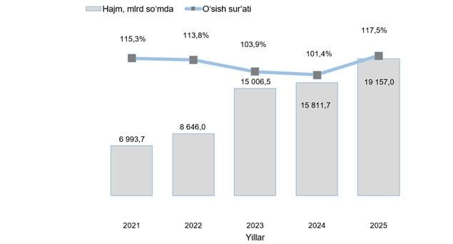 Farg‘ona viloyati statistika boshqarmasining bergan ma'lumotiga ko‘ra, 2025- yilning yanvar-dekabr oylarida, Farg‘ona viloyatida jami 19 157,0 mlrd so‘mlik qurilish ishlari bajarilib, 2024- yilning mos davriga nisbatan 117,5 % ni tashkil etdi.