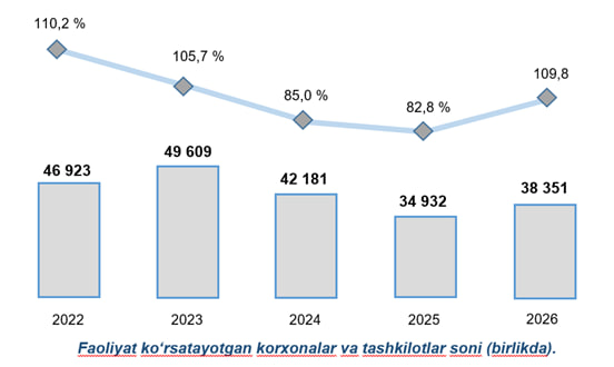 2026- yil 1- fevral holatiga koʻra, viloyatda faoliyat koʻrsatayotgan korxonalar va tashkilotlar soni (dehqon va fermer xoʻjaliklari bundan mustasno) 38,4 mingtani tashkil etadi, shundan 31,8 mingtasi yoki 82,9 foizi kichik korxona va mikrofirmalardir. 2025 yilning shu davriga nisbatan o‘sish sur’ati 109,8 foizni, jumladan, kichik biznes va mikrofirmalarda – 111,5 foizni tashkil etdi.