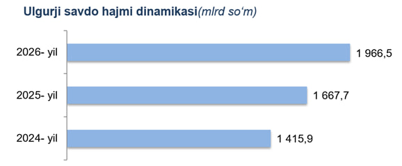 Hisobot davrida ulgurji savdo tovar aylanmasi 1 966,5 mlrd so‘mni tashkil etib, 2025- yilning mos davriga nisbatan 11,9 % ga o‘sdi.