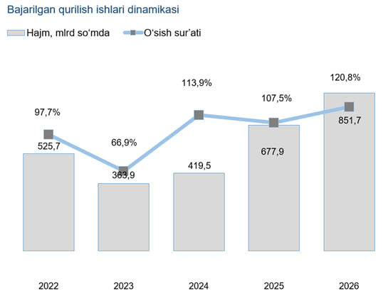 Farg‘ona viloyati statistika boshqamasining ma'lumotiga ko‘ra, 2026-yil yanvar oyida, Farg‘ona viloyatida jami 851,7 mlrd so‘mlik qurilish ishlari bajarilib, 2025- yilning mos davriga nisbatan 120,8 % ni tashkil etdi.