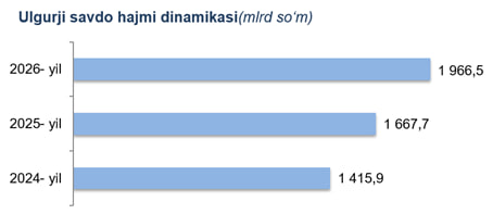 Viloyat bo‘yicha 2026- yilning yanvar oyida ulgurji savdo tovar aylanmasi 1 966,5 mlrd so‘mni tashkil etib, 2025- yilning mos davriga nisbatan 11,9 % ga o‘sdi.