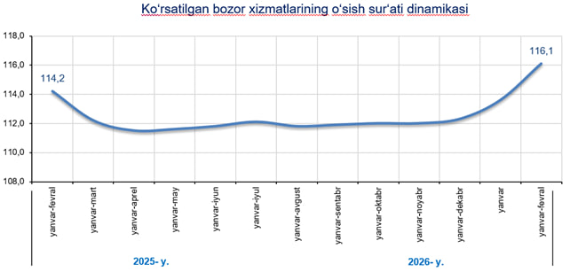 Farg‘ona viloyati statistika boshqarmasi bergan ma'lumotiga ko‘ra, 2026-yil yanvar-fevral oyida dastlabki ma’lumotlar bo‘yicha, norasmiy va yashirin iqtisodiyotni baholash bo‘yicha o‘tkazilgan statistik kuzatuvlar natijalarini hisobga olgan holda, bozor xizmatlari hajmi 11 168,4 mlrd so‘mni tashkil etdi. 2025- yil mos davriga nisbatan o‘sish sur’ati 116,1 % ni tashkil etib, uning hajmi esa 2 095,6 mlrd so‘mga o‘sishi qayd etildi.