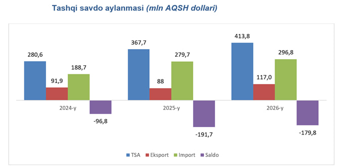 Farg‘ona viloyati statistika boshqarmasi bergan ma'lumotiga ko‘ra,2026- yil yanvar-fevral oyida viloyatning tashqi savdo aylanmasi 413,8 mln AQSH dollariga yetdi va 2025- yilning yanvar-fevral oyiga nisbatan 46,1 mln AQSH dollariga yoki 112,5 % ga ko‘paydi.