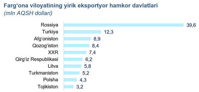 Tashqi savdo aylanmasida tovarlar va xizmatlar eksporti bo‘yicha asosiy hamkorlarimiz Rossiya (33,9 %), Turkiya (10,5 %), Afg‘oniston (7,7 %), Qozog‘iston (7,2 %), XXR (6,3 %), Litva (5,0 %), Qirg‘iz Respublikasi (5,3 %), Turkmaniston (4,4%), Polsha (3,7 %) va Tojikiston (2,8 %), kabi davlatlar bo‘lgan. Ularning umumiy eksportdagi ulushi 86,8 % ni tashkil etdi.