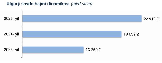 Farg‘ona viloyati statistika boshqarmasi bergan ma'lumotiga ko‘ra, 2025- yil 1- noyabr holatiga ulgurji savdo sohasida faoliyat ko‘rsatayotgan tijorat korxonalari soni 4 282 tani tashkil etgan.
