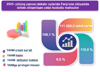 Dastlabki ma’lumotlarga ko‘ra, 2025- yilning yanvar-dekabr oylarida Farg‘ona viloyati bo‘yicha yalpi hududiy mahsulot (keyingi o‘rinlarda – YAHM) hajmi joriy narxlarda 111 305,3 mlrd so‘mni tashkil etdi va 2024- yilning yanvar-dekabr oylari bilan taqqoslaganda 8,1 % ga o‘sdi.