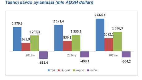 2025- yil yanvar-dekabr oylarida viloyatning tashqi savdo aylanmasi (matnda TSA) 2 668,4 mln AQSH dollariga yetdi va 2024- yilning yanvar-dekabr oylariga nisbatan 497,0 mln AQSH dollariga yoki 22,9 % ga ko‘paydi.
