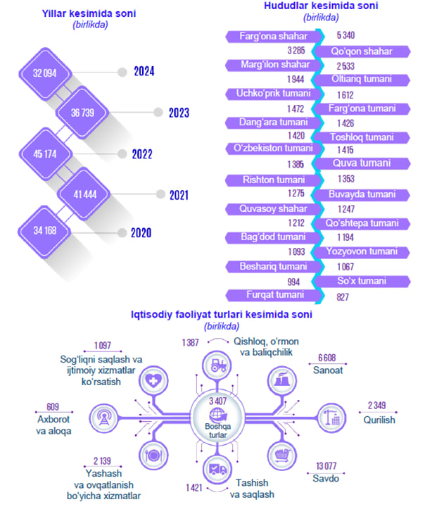 2025-yil 1-fevral holatiga Farg‘ona viloyatida faoliyat ko‘rsatayotgan xususiy korxonalar soni 5 131 tani tashkil etdi.