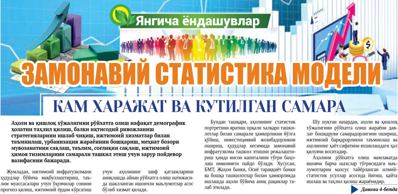 “Yangi O‘zbekiston” gazetasining 2025 yil 30 sentyabrdagi 201-sonida Milliy statistika qo‘mitasi raisi Behzod Hamrayevning “Zamonaviy statistika modeli: kam xarajat va kutilgan samara” nomli maqolasi chop etildi.