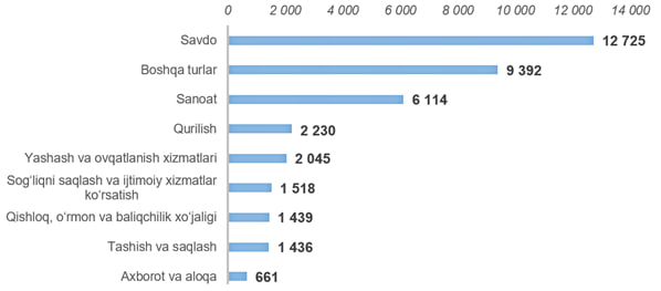 Farg‘ona viloyati statistika boshqarmasining bergan ma’lumotiga ko‘ra, iqtisodiy faoliyat turlari boʻyicha faoliyat yuritayotgan korxona va tashkilotlarning (tadbirkorlik subyektlari va kichik biznes subyektlarining) eng koʻp qismi “Savdo” tarmogʻida qolmoqda.