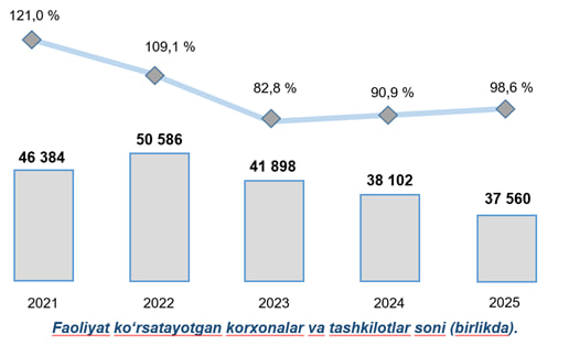 2025- yil 1- sentabr holatiga koʻra, viloyatda faoliyat koʻrsatayotgan korxonalar va tashkilotlar soni (dehqon va fermer xoʻjaliklari bundan mustasno) 37,6 mingtani tashkil etadi.