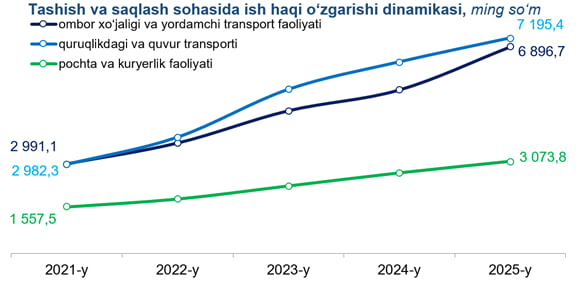 Farg‘ona viloyati statistika boshqarmasi bergan ma'lumotiga ko‘ra, Farg‘ona viloyatida tashish va saqlash sohasida o‘rtacha oylik ish haqi 6 776,5 ming so‘mni tashkil etgan.