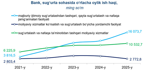Farg‘ona viloyati statistika boshqarmasi bergan ma'lumotiga ko‘ra, Farg‘ona viloyatida bank, sug‘urta sohasida o‘rtacha oylik ish haqi 10 666,4 ming so‘mni tashkil etgan