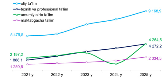 Farg‘ona viloyati statistika boshqarmasi bergan ma'lumotiga ko‘ra, Farg‘ona viloyatida ta’lim sohasida o‘rtacha oylik ish haqi 3 931,1 ming so‘mni tashkil etgan