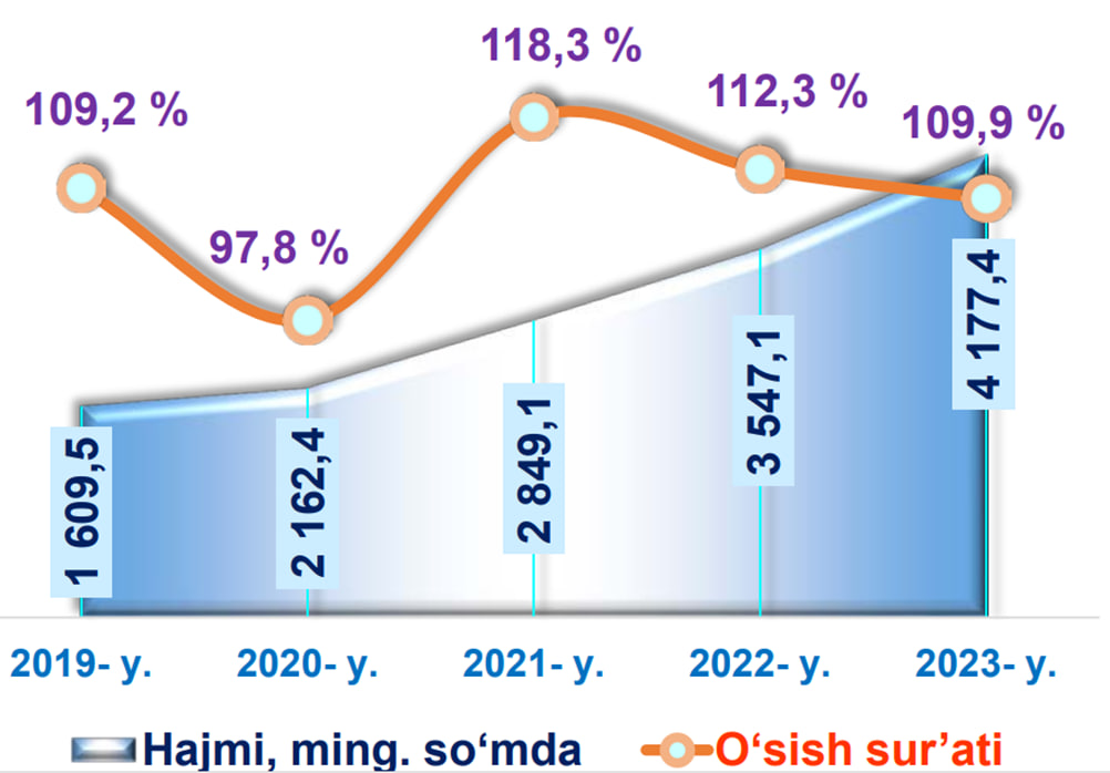 2023- yil yanvar-dekabr oylarida yangi tashkil etilgan korxona va tashkilotlar soni 2019- yilning mos davri bilan solishtirilganda 1 224 taga ko‘payganligini ko‘rish mumkin.