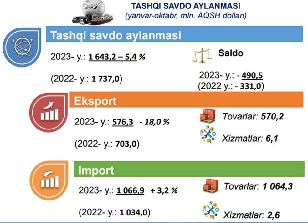 2023- yil yanvar-oktabr oylarida viloyatning tashqi savdo aylanmasi 1 643,2 mln. AQSH dollariga yetdi
