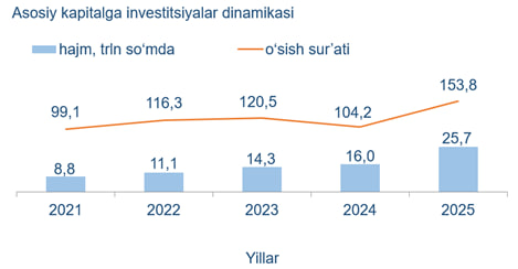 So‘nggi besh yildagi asosiy kapitalga investitsiyalar hajmi dinamikasi shuni ko‘rsatmoqdaki, u deyarli 2,9 barobarga ko‘paydi, ayniqsa joriy davrda o‘tgan yilga nisbatan 9,7 trln so‘mga ko‘p investitsiyalar o‘zlashtirildi