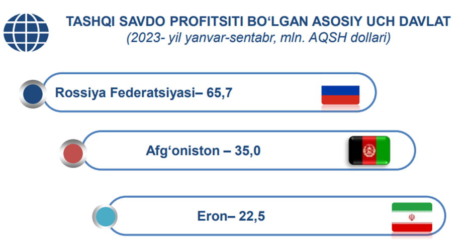 Tashqi iqtisodiy faoliyat bo‘yicha 20 ta yirik hamkor davlatlar orasidan oltita davlatda ijobiy tashqi savdo balansi kuzatilgan. Xususan, Afg‘oniston, Eron va Rossiya Federatsiyasi shular jumlasidandir. Qolgan 14 ta davlatlar bilan manfiy tashqi savdo balansi saqlanib qolmoqda.