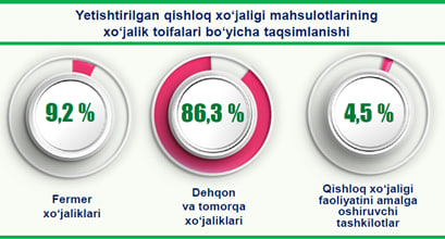 Farg‘ona viloyati statistika boshqarmasining bergan ma'lumotiga ko‘ra, 2025- yilning yanvar-mart oylarida xo‘jalik toifalari bo‘yicha tahlillarga ko‘ra, qishloq xo‘jaligi mahsulotlari umumiy hajmining 86,3 % i dehqon va tomorqa xo‘jaliklariga, 9,2 % i fermer xo‘jaliklariga, 4,5 % i qishloq xo‘jaligi faoliyatini amalga oshiruvchi tashkilotlarga to‘g‘ri kelmoqda.