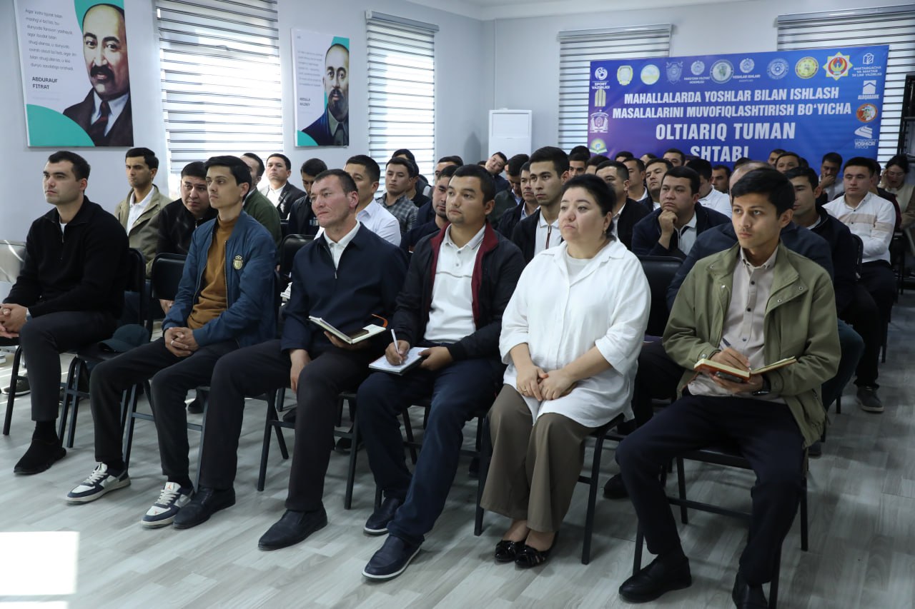 Joriy yilning 23- oktabr kuni Oltiariq tumani hokimligi hamda tuman statistika bo‘limi tomonidan mahalla fuqarolar yig‘ini yoshlar yetakchilari ishtirokida O‘zbekiston Respublikasi Prezidentining 2025-yil 19-sentabr kuni “O‘zbekiston Respublikasida aholi va qishloq xo‘jaligini ro‘yxatga olish tadbirini o‘tkazish to‘g‘risida”gi 173-sonli Farmoni hamda O‘zbekiston Respublikasi Vazirlar Mahkamasining 2025-yil 7- oktabrdagi “Oְ‘zbekiston Respublikasida aholi va qishloq xo‘jaligini ro‘yxatga olish tadbirini o‘tkazish chora-tadbirlari to‘g‘risida”gi 629-sonli Qarorining ijrosini ta'minlash maqsadida o‘qiv seminari tashkil etildi.
