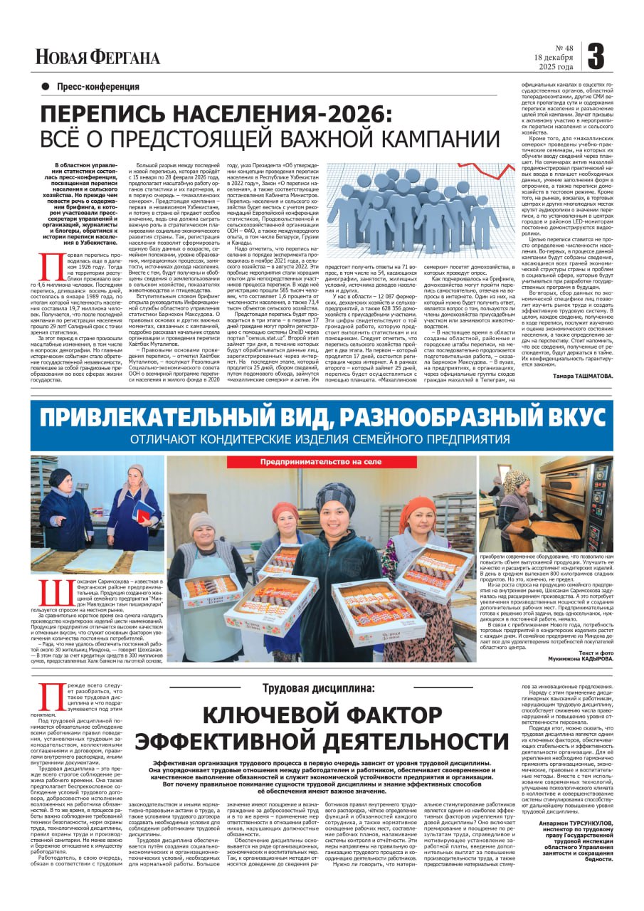 Farg‘ona viloyati statistika boshqarmasida “O‘zbekiston Respublikasi Prezidentining 2025-yil 19-sentabrdagi “O‘zbekiston Respublikasida aholi va qishloq xo‘jaligini ro‘yxatga olish tadbirini o‘tkazish to‘g‘risida”gi 173-sonli Farmoniga sharh va bugungi kungacha amalga oshirilgan ishlar yuzasidan hisoboti mavzusida” o‘tkazilgan matbuot anjumani tafsilotlari “Новая Фергана” gazetasining 2025-yil 18-dekabrdagi 48-sonida chop etildi.