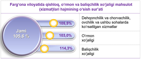 Dastlabki ma’lumotlarga ko‘ra, 2025-yilning yanvar-dekabr oylarida qishloq, o‘rmon va baliqchilik xo‘jaligi mahsulot (xizmat) larining umumiy hajmi 49 733,5 mlrd so‘mni, shu jumladan, dehqonchilik va chorvachilik, ovchilik va ushbu sohalarda ko‘rsatilgan xizmatlar – 48 806,6 mlrd so‘mni, o‘rmon xo‘jaligi – 583,5 mlrd so‘mni, baliqchilik xo‘jaligi – 343,3 mlrd so‘mni tashkil qildi.